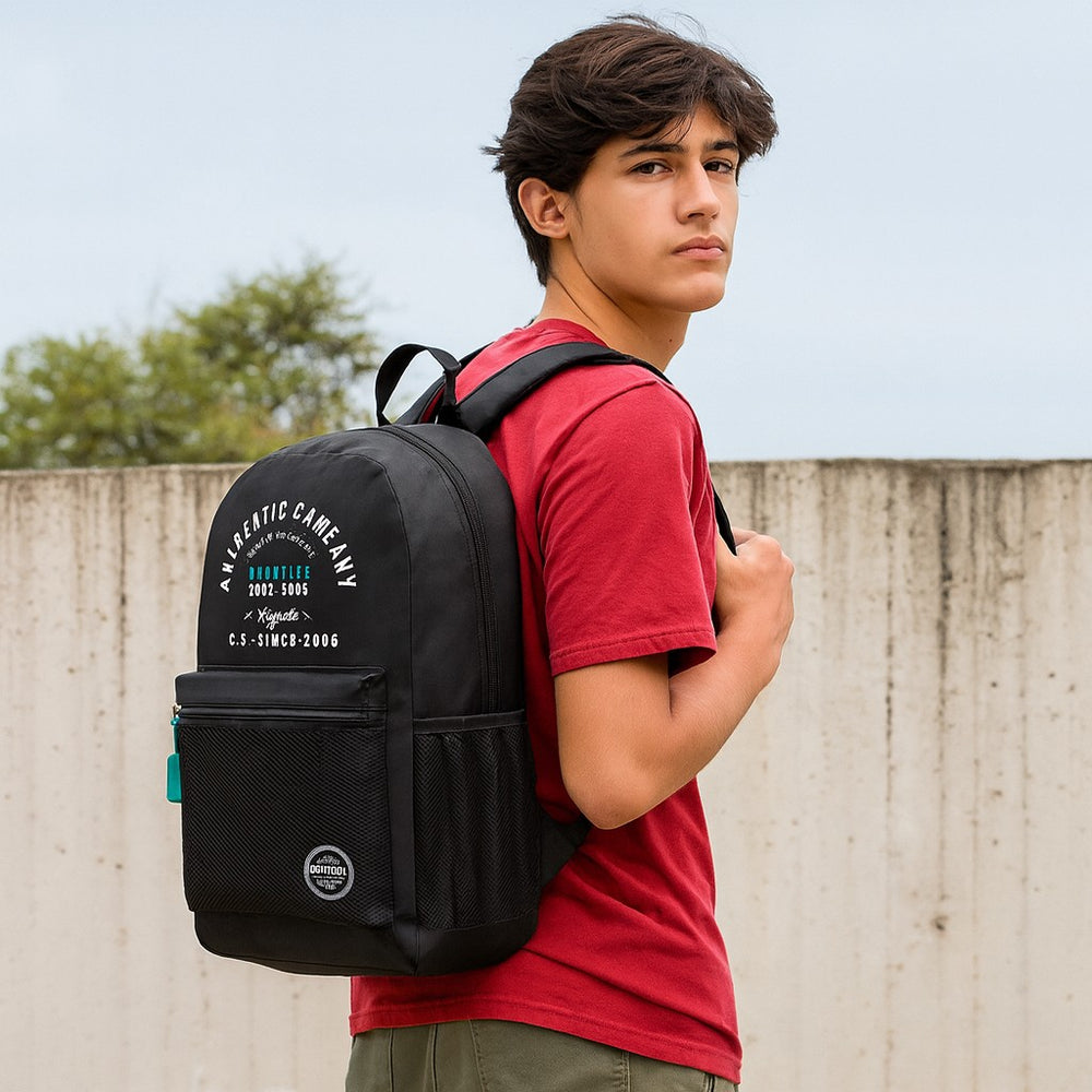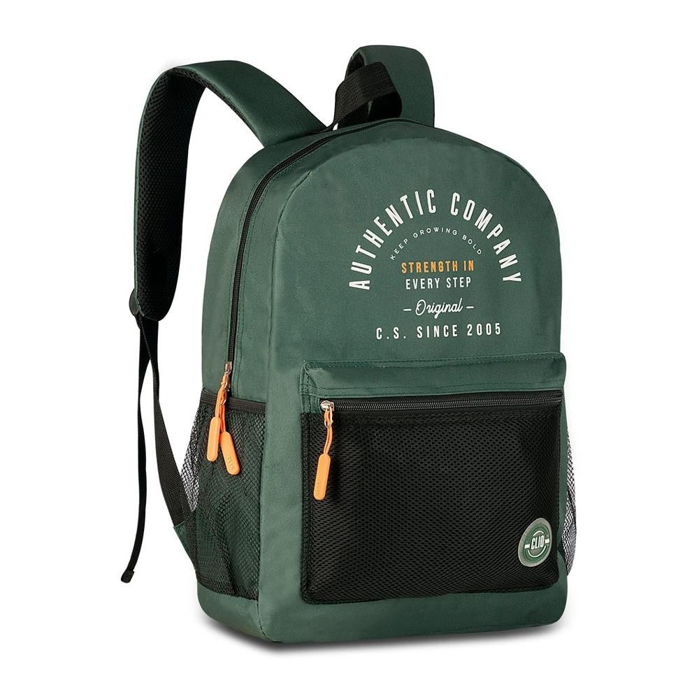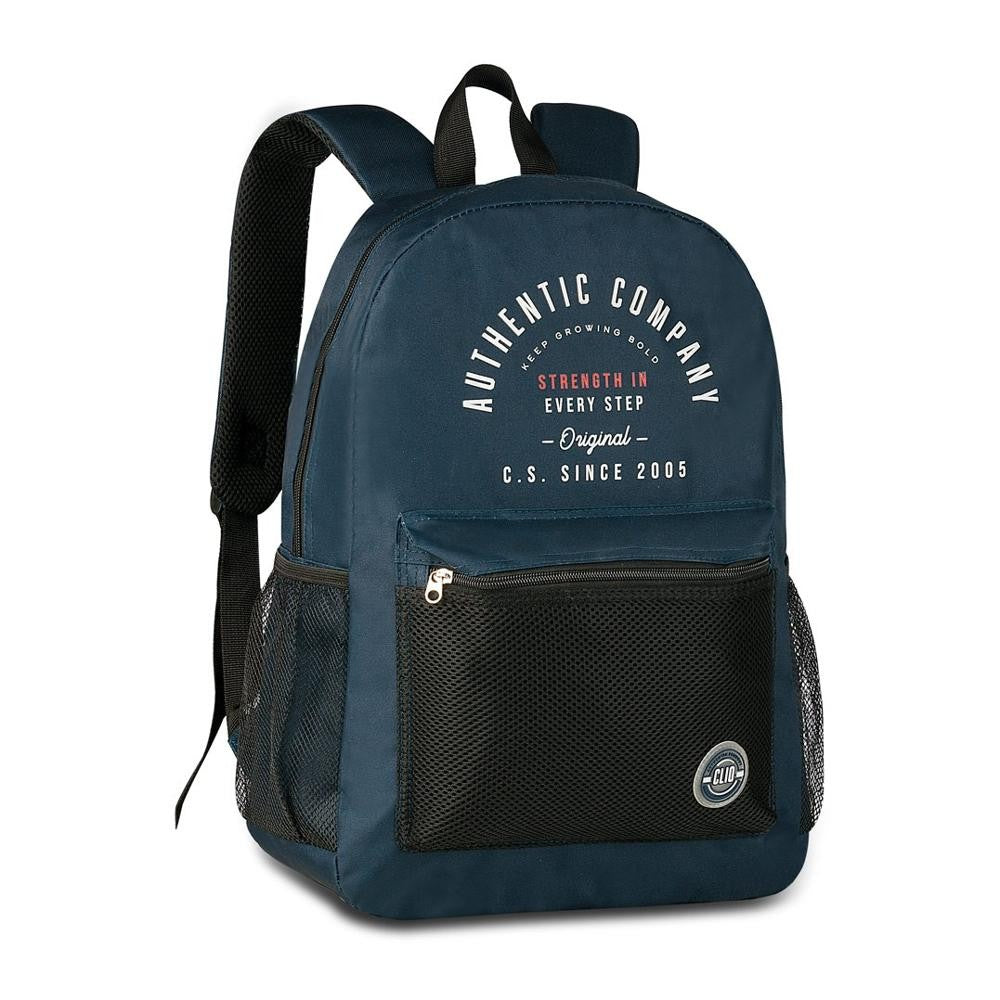 Prática, resistente e estilosa, a Mochila Clio Authentic Company é ideal para o dia a dia escolar, faculdade ou uso casual. Produzida em material durável, possui amplo compartimento principal com fechamento em zíper com puxador personalizado, bolso frontal com tela para pequenos objetos e bolsos laterais em rede para garrafas. As alças são acolchoadas e ajustáveis, garantindo conforto no transporte. Com design moderno estampado na parte frontal e puxadores personalizados, a mochila une funcionalidade e estilo em diferentes cores: Preto, Azul e Verde.