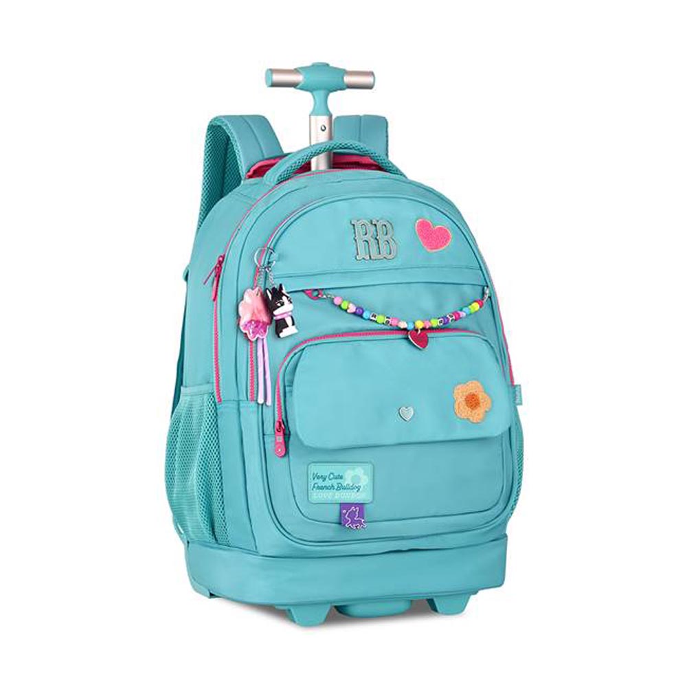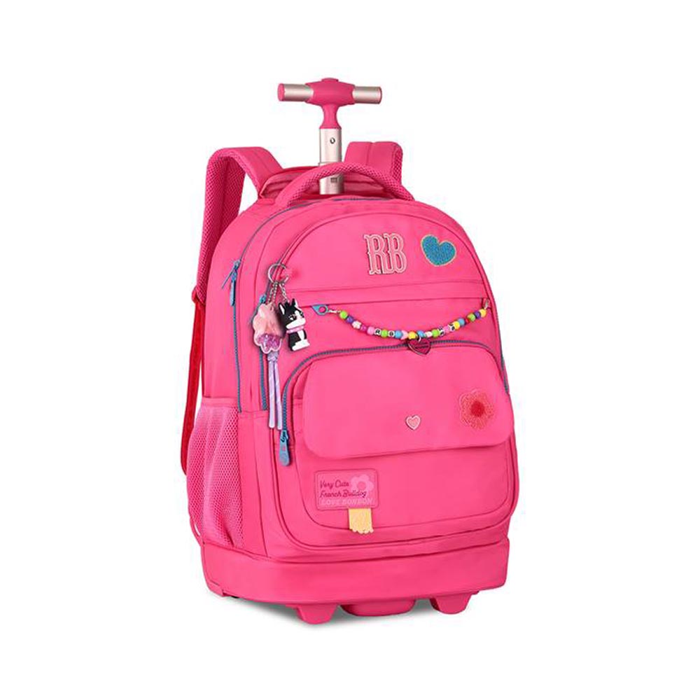 Mochila de Rodinha Rebecca Bonbon Love Colors confeccionada em material super resistente, possui um design moderno charmoso. Essa mochila além de muito linda, ela vem com 3 lindos chaveiros que são 1 chaveiro de corda, 1 fofíssima Rebecca Bonbon em 3D e 1 chaveiro em formato de flor com paetê de estrelinha dentro, possui patches atoalhados e os detalhes de miçangas, possui botão de coração magnético, que arrematam o visual com charme e sofisticação. Conta com bolsos principal com amplo espaço e ainda com compartimento interno, e com diversos bolsos na parte frontal, e bolsos na lateral telados com elásticos para colocar garrafinha e também outros objetos.