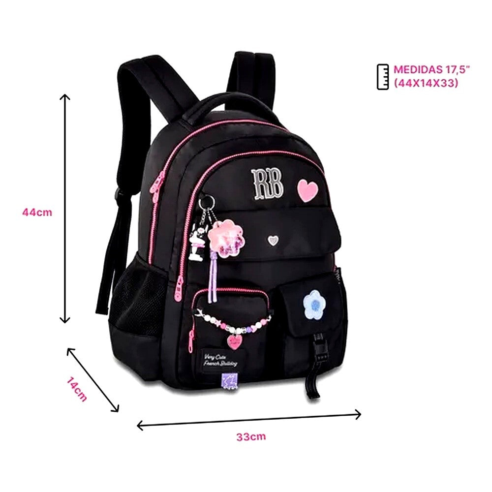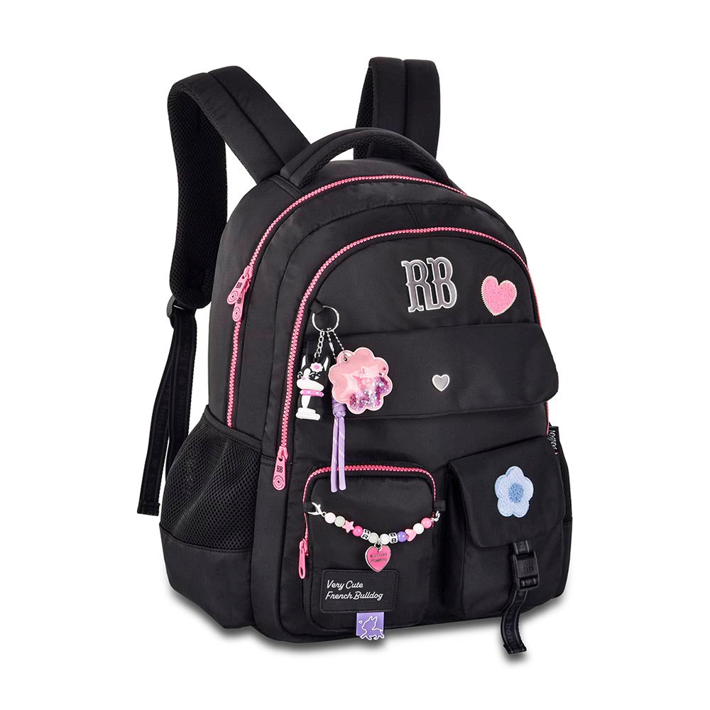 Mochila Escolar Rebecca Bonbon Love Black confeccionada em material super resistente, possui um design moderno na cor preta, 1 chaveiro de corda e a fofíssima Rebecca Bonbon em 3D, possui patches atoalhados e os detalhes de miçangas, possui botão de coração magnético e uma flor em 3D, que arrematam o visual com charme e sofisticação.
