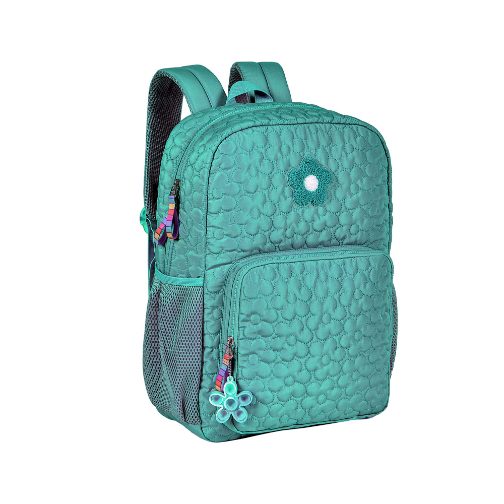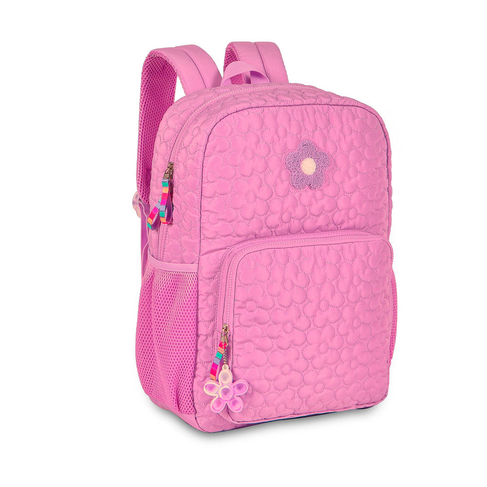 Além de linda, ela é resistente e possui: 1 bolso grande com bolso interno para notebook e 1 bolso pequeno interno para pequenos objetos, bolso frontal médio e 2 bolsos laterais telados com elástico. Fechamento com zíper personalizado super fofo. Detalhes com um bordado incrível formando flores. Chaveiro que é a sensação do momento pop it em formato de flor. Alça de mão, alças para costas ajustáveis e acolchoadas.