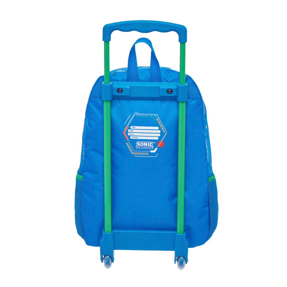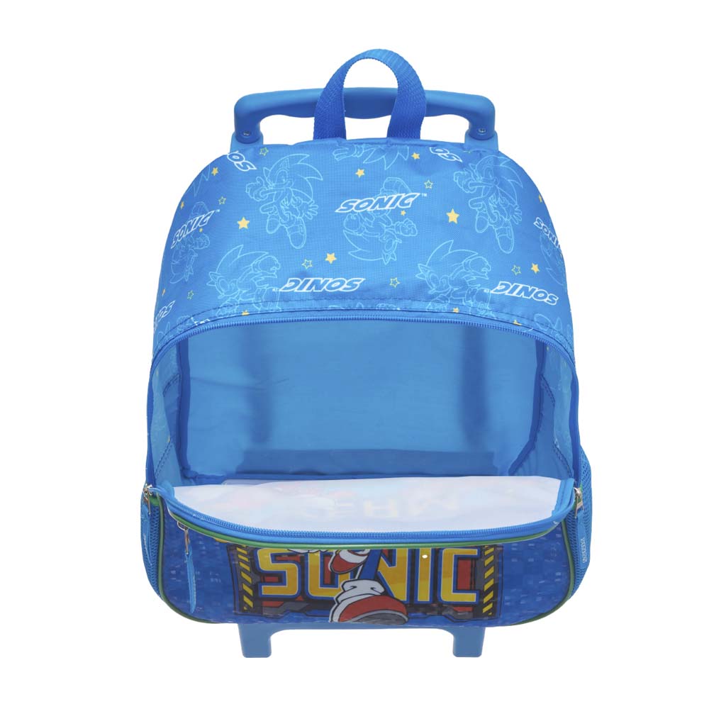 Ideal para auxiliar na organização dos materiais escolares, a mochila conta ainda com bolso principal com bastante espaço interno e bolso frontal com estampa do Sonic em PVC. A mochila possui ainda dois bolsos laterais telados, ideal para o transporte de garrafinha, identificador na parte traseira e fechamento em zíper com puxador em fita de gorgurão personalizado.