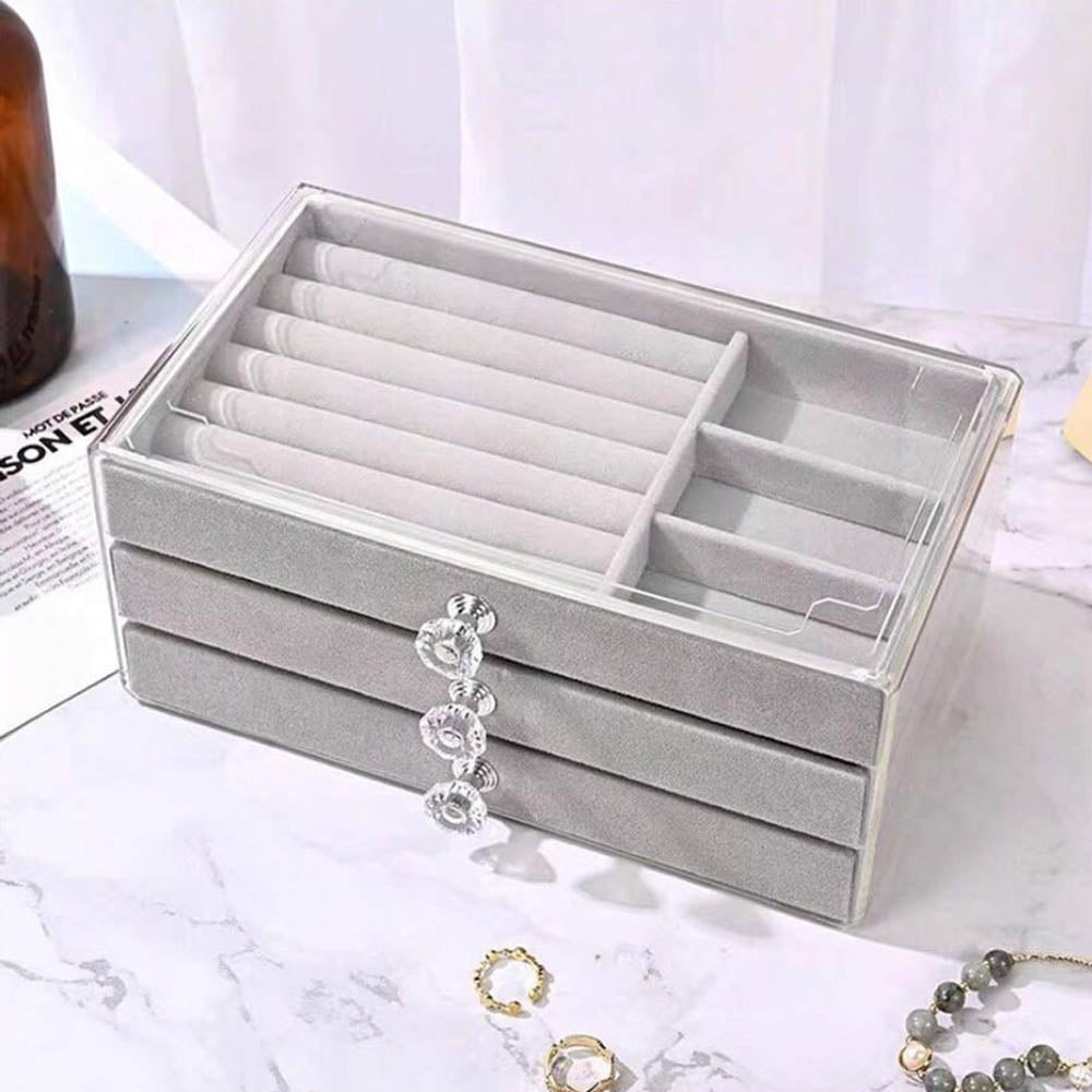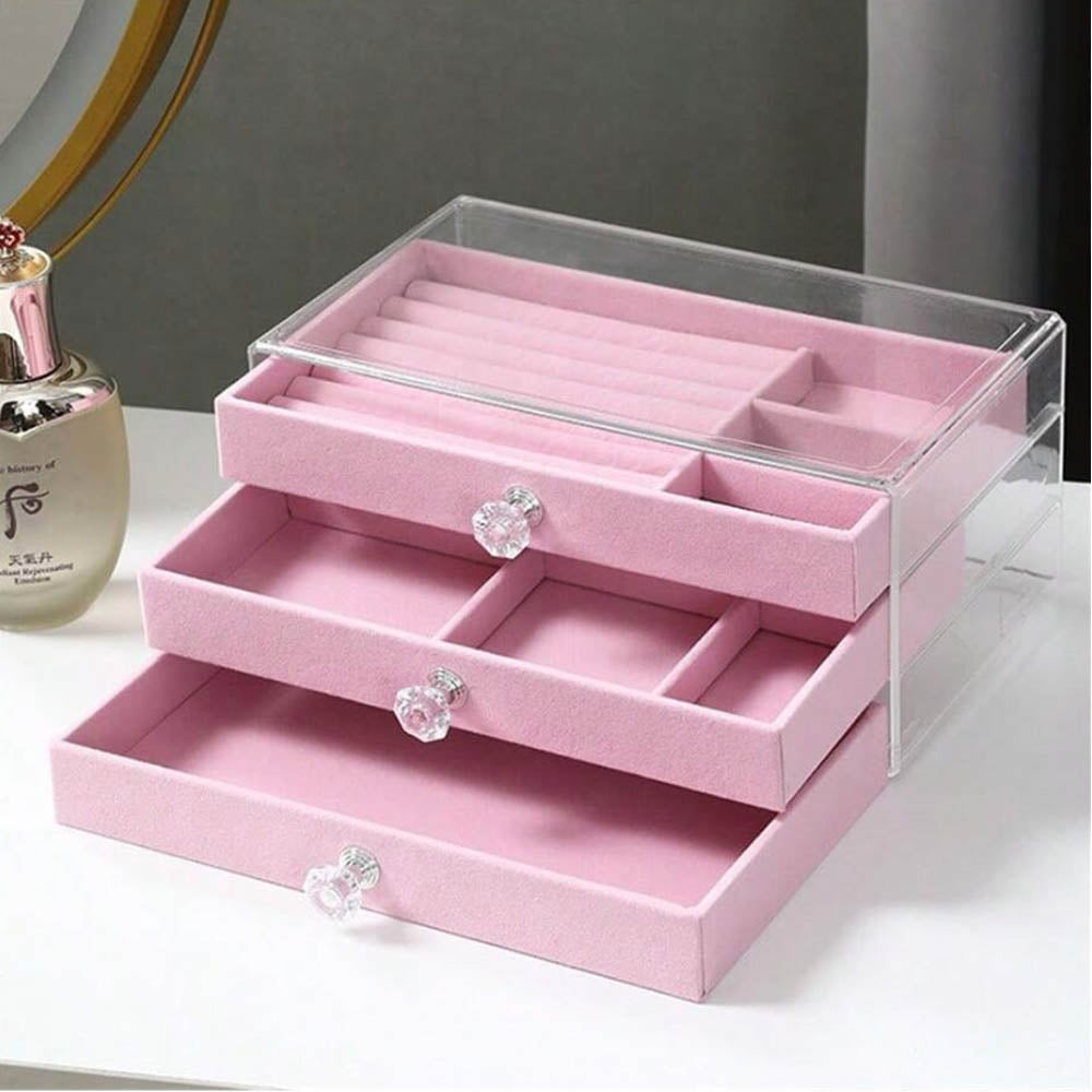 Ideal para a organização de joias, o Porta Joias de Acrílico com 3 gavetas proporciona praticidade e elegância na armazenagem de brincos, anéis e pequenos acessórios.Com design transparente, facilita a visualização e seleção das peças, otimizando o seu tempo e espaço.