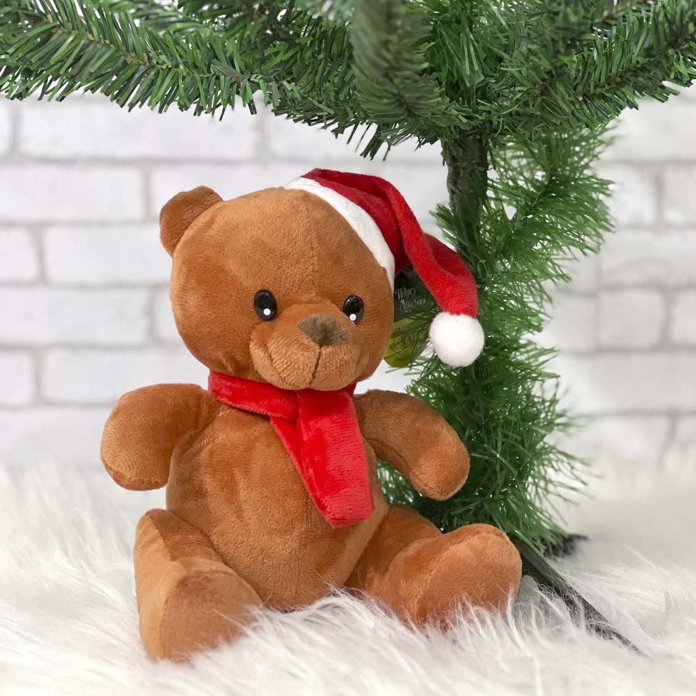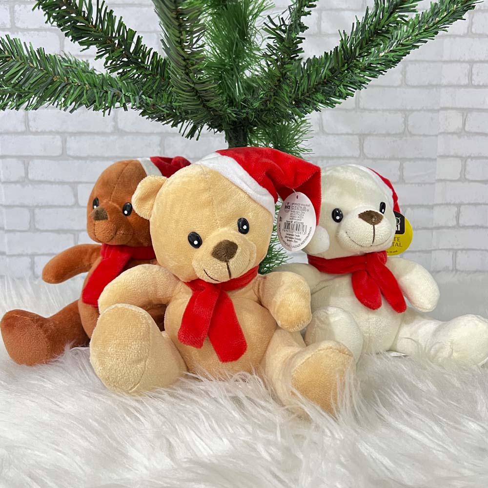 Garanta uma decoração super fofa com o Ursinho de Pelúcia para Decoração de Natal com cachecol e gorro vermelho, possui um toque super macio e suave.